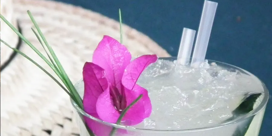 - Decora el vaso con una rebanada de pepino con cáscara, cebollín y una hoja de bugambilia.