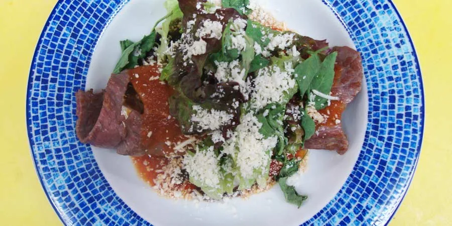 - Cuando esté lista la cecina, extiende para formar una “tortilla de carne” que rellenarás con los huauzontles y la ensalada de queso.