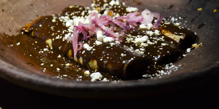 - Pasa las tortillas por la salsa de mole, rellena con la carne y enrolla. Inmediatamente, baña con un poco mas de mole.