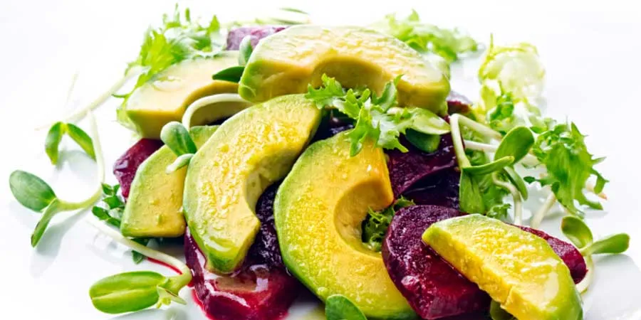 - Coloca en un plato los betabeles y los aguacates bajo una cama de germinado de cebollín.