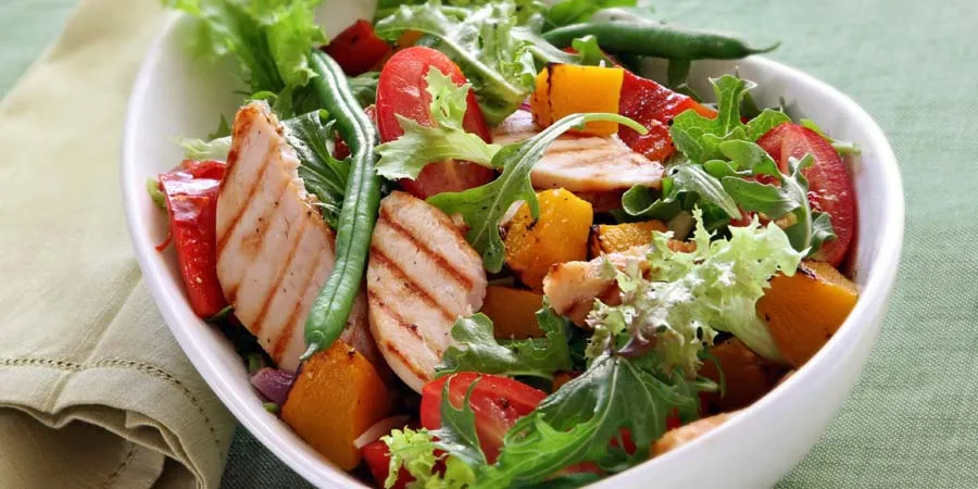 Ensalada de pollo, lechuga, durazno, tomate y limón