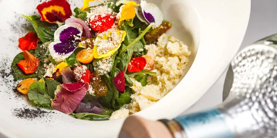 - Espolvorea la ensalada con el polvo de palomitas y la ceniza de quelite alrededor del plato. Aliña con la vinagreta.
