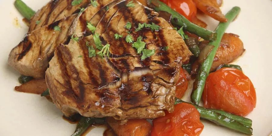 - Sazona el atún, con sal, pimienta y limón. Agrega a la parrilla y barniza con el mernier.