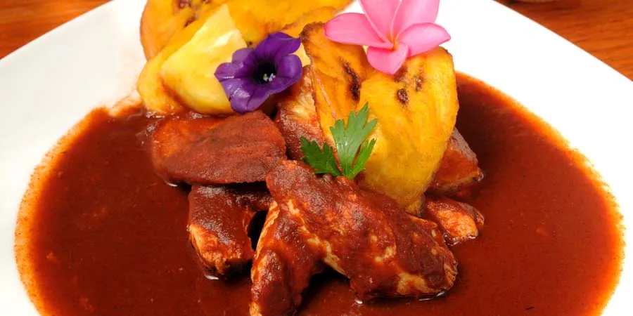 - Sirve con una pieza de pollo y adorna con piña y plátano macho.