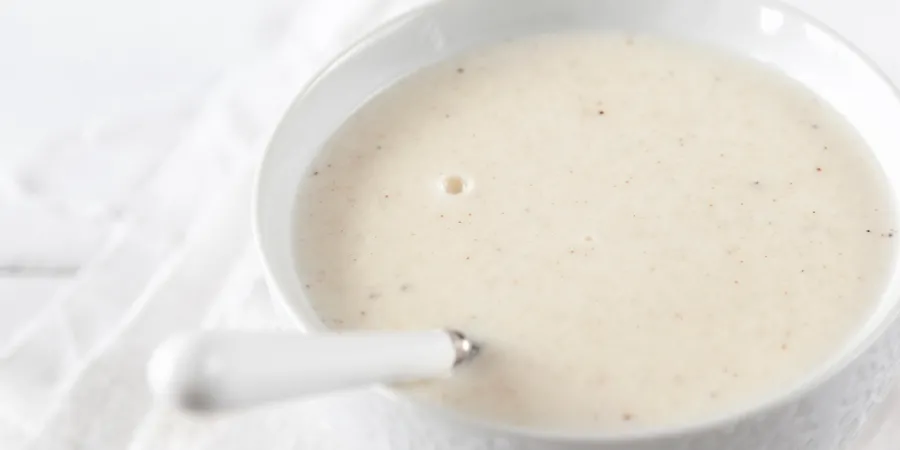 - Quita la sartén del fuego y añade la leche hirviendo sobre la harina y la cebolla, moviendo rápidamente.