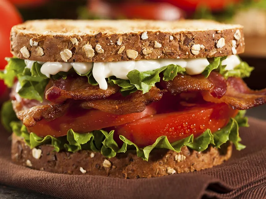 - Agrega una hoja de lechuga encima de cada tapa junto con una rebanada de tomate y 3 o 4 rebanadas de tocino.
