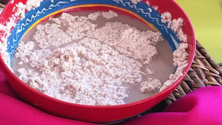 - Mezcla lo anterior con el nicuanextle. En una cazuela grande de barro bate con las manos y los brazos vigorosamente y agrega poco a poco agua fría para que saque espuma (debe tener mucha).