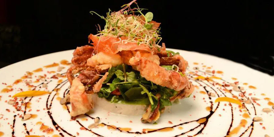Algunos platillos que integran la esencia de Blouet y su equipo en Cafe des Artistes son el dorado adobado y cocinado al horno, que se sirve sobre enchiladas rellenas de verduras con un queso huichol de la Sierra; el steak de lengua de res con salsa verde taquera, arenas de tortilla azul y una salsa de reducción de vino tinto y flor de jamaica; y el pulpo adobado y sellado a la plancha con nube de papa con clorofila y salsa de chorizo con tomatitos orgánicos.