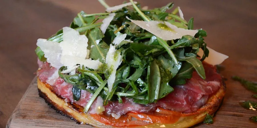 Te recomiendo como entrada una tarta fina de jitomate con carpaccio de res que se elabora con filete de importación cocido con limón y aceite. Se cubre con arúgula, sal y dos finas capas de parmesano Grana Padano y pesto de arúgula. La consistencia del hojaldre crujiente y humedecido por el fino sabor de la mantequilla te hace viajar a ese sabor que sólo la pâtisserie française logra.