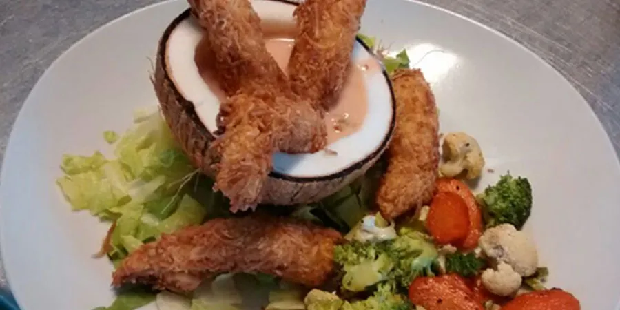 En su menú encontrarás filete de pescado, chilaquiles de camarón, cocteles, empanadas, pulpo asado, tostadas, mojarras frescas, exóticas brochetas, camarón aguachile, fectuccini con camarón, langosta al mojo de ajo, y su platillo estrella: los camarones al coco acompañados con un rica salsa agridulce.