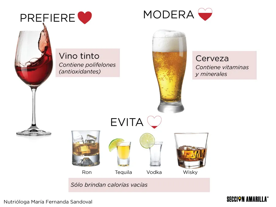 Lo que nos recomienda la nutrióloga es que si vamos a consumir un trago, seleccionemos vino tinto y cerveza, ya que a diferencia de los otros, éstos brindan más que calorías vacías. El vino tinto es fuente de polifenoles y la cerveza de vitaminas y minerales esenciales.