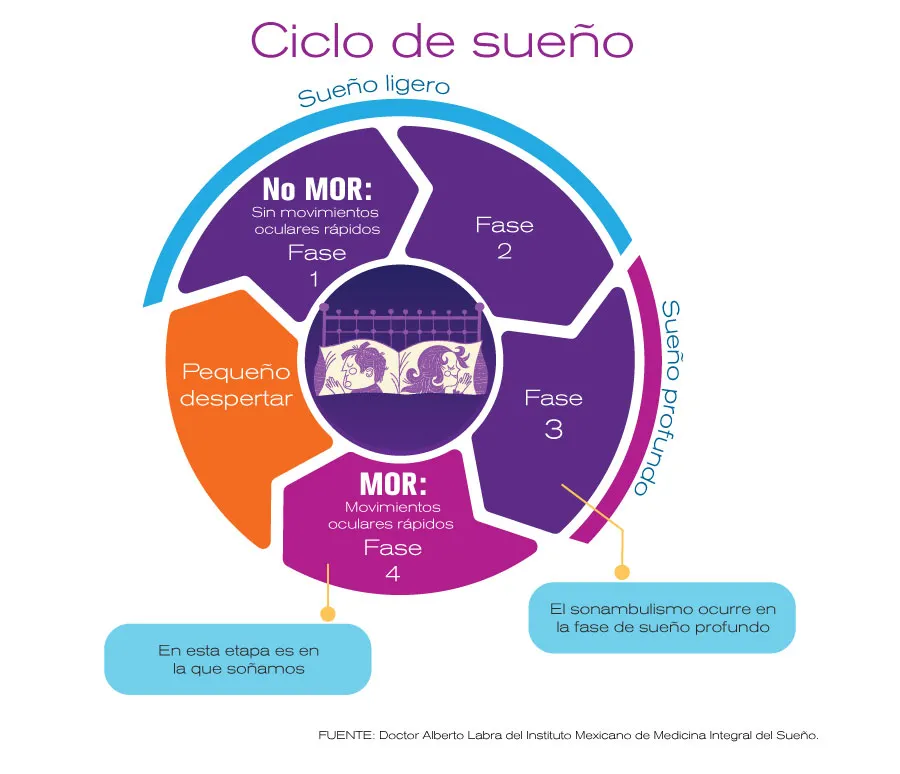 Este ciclo dura de 1 hora y media a 2 horas y consta de cuatro fases como se ve en la infografía.