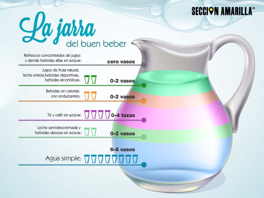 Como puedes ver, el agua natural es el nivel más grande dentro de la jarra, por lo que debes tomar mucho más agua natural que otros líquidos para el buen funcionamiento de tu organismo.