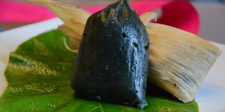 - Coloca una parte de la masa en la hoja de maíz remojada, al centro un poco del relleno y cierra.