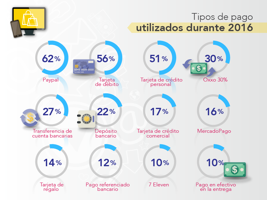 De acuerdo al estudio de Comercio Electrónico 2016 que hace la Asociación Mexicana de Internet (Amipci) estos son los tipos de pago más usados durante 2016: